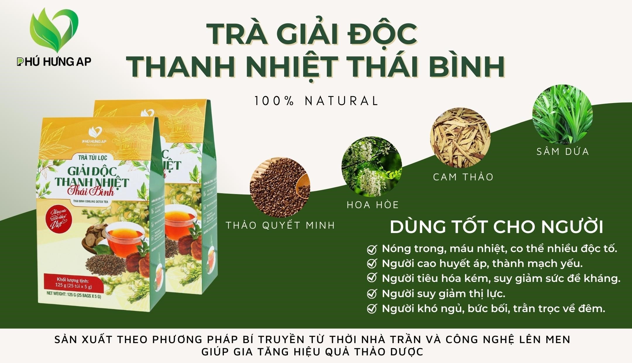Trà (chè) giải độc thanh nhiệt Thái Bình là một sản phẩm đến từ thương hiệu Phú Hưng AP, được sản xuất tại Việt Nam với thành phần chính là các loại thảo dược như Thảo Quyết Minh, Hoa Hoè và Cam Thảo. Sản phẩm này được thiết kế với mục đích hỗ trợ giảm đau đầu, mát gan và thải độc cơ thể.