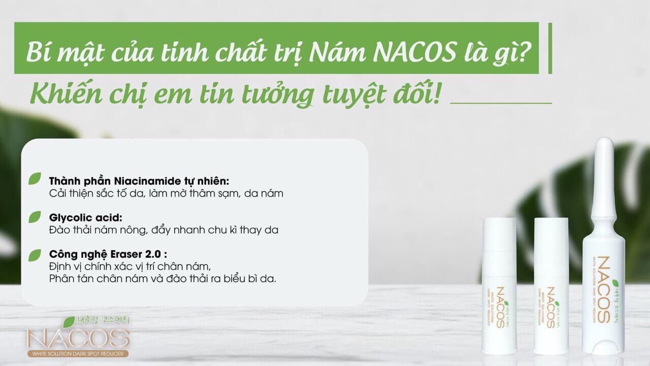 Kem trị nám Nacos Hàn Quốc sử dụng công nghệ Eraser 2.0, một công nghệ tiên tiến từ Hàn Quốc nhưng được tập đoàn Coreana đưa vào trong mỹ phẩm với nhãn hiệu Nacos, dòng chuyên biệt cho điều trị nám. Với công nghệ này khi tiếp xúc với vết nám sâu bên trong da sẽ tự xác định vị trí vết nám và cắt đứt mối liên kết tạo ra melanin, đào thải toàn bộ các hắc sắc tố dưới da lên trên bề mặt da, sau đó sẽ đào thải từ từ mà không làm bong tróc hay bào mòn da. Với phương pháp này, da các chị em sẽ hết nám triệt để nhưng không bị xâm lấn, bào mòn như các phương pháp bắn lazer hay lăn kim, phi kim hay mỹ phẩm lột da.