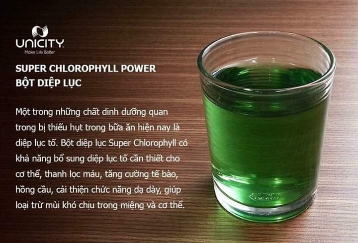 Một trong những chất dinh dưỡng quan trọng bị thiếu hụt trong bữa ăn hiện nay là diệp lục tố. Bột diệp lục Super Chlorophyll có khả năng bổ sung diệp lục tố cần thiết cho cơ thể, thanh lọc máu, tăng cường tế bào, hồng cầu, cải thiện chức năng dạ dày, giúp loại trừ mùi khó chịu trong miệng và cơ thể.