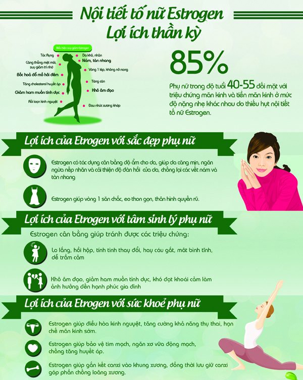 Nội tiết tố nữ giúp tạo ra những đường cong gợi cảm trên cơ thể phái đẹp, giúp cho thân hình quyến rũ và mềm mại hơn. Bên cạnh đó với tính chất giữ nước, Estrogen còn góp phần đem lại làn da mịn màng, tươi tắn và hồng hào hơn, hạn chế các vết nhăn, nám trên khuôn mặt.