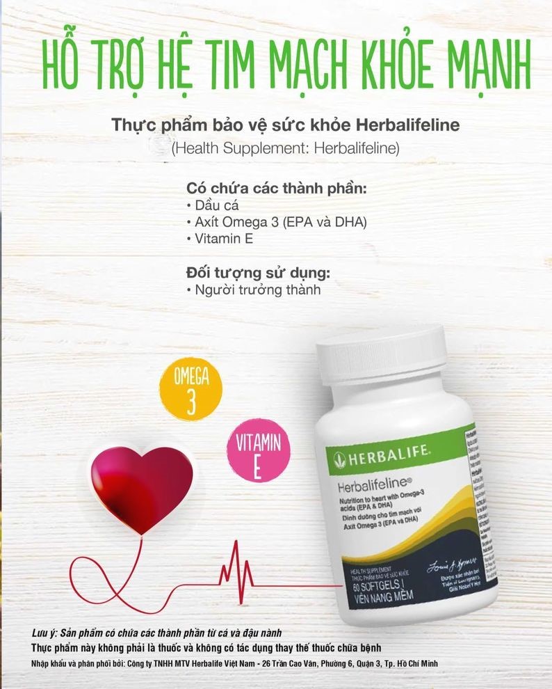 - Herbalifeline omega chuyên hỗ trợ tim mạch, giúp điều hòa huyết áp, làm giảm cholesteron và tryglycerids trong máu (là nguyên nhân chính gây xơ vữa động mạch, gây nhiễm mỡ trong các mô…), loại bỏ các tạp chất trong quá trình chuyển hóa các độc tố ra khỏi máu.