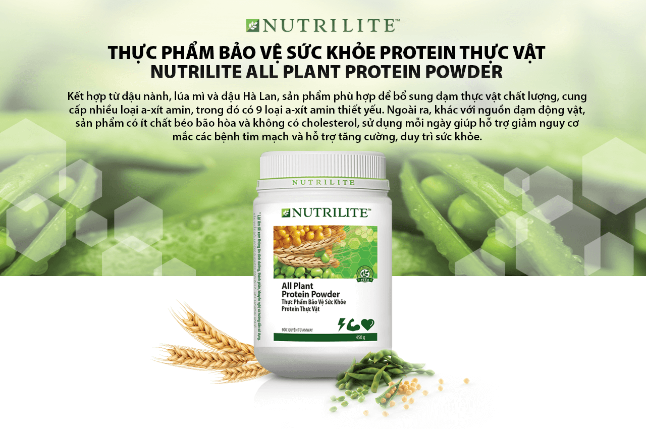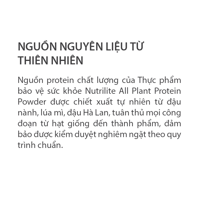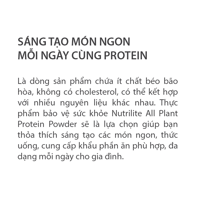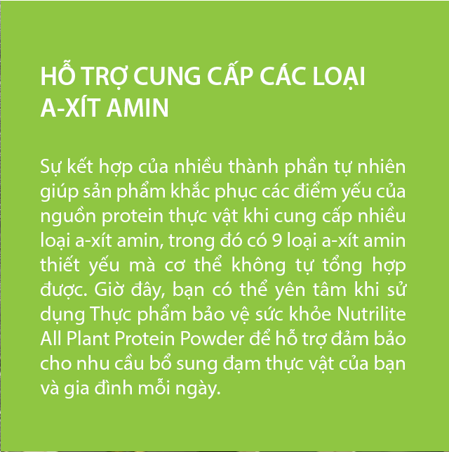 Thông tin dinh dưỡng: Với mỗi khẩu phần tương đương với 10g Nutrilite All Plant Protein Powder cung cấp Năng lượng 170KJ/40Kcal, 8g Protein, 0,5g tổng lượng chất béo (chất béo bão hòa - ≤ 0,15g), 0,3g tổng Carbonhydrate (Đường- ≤ 0,15g) và 100mg Natri.