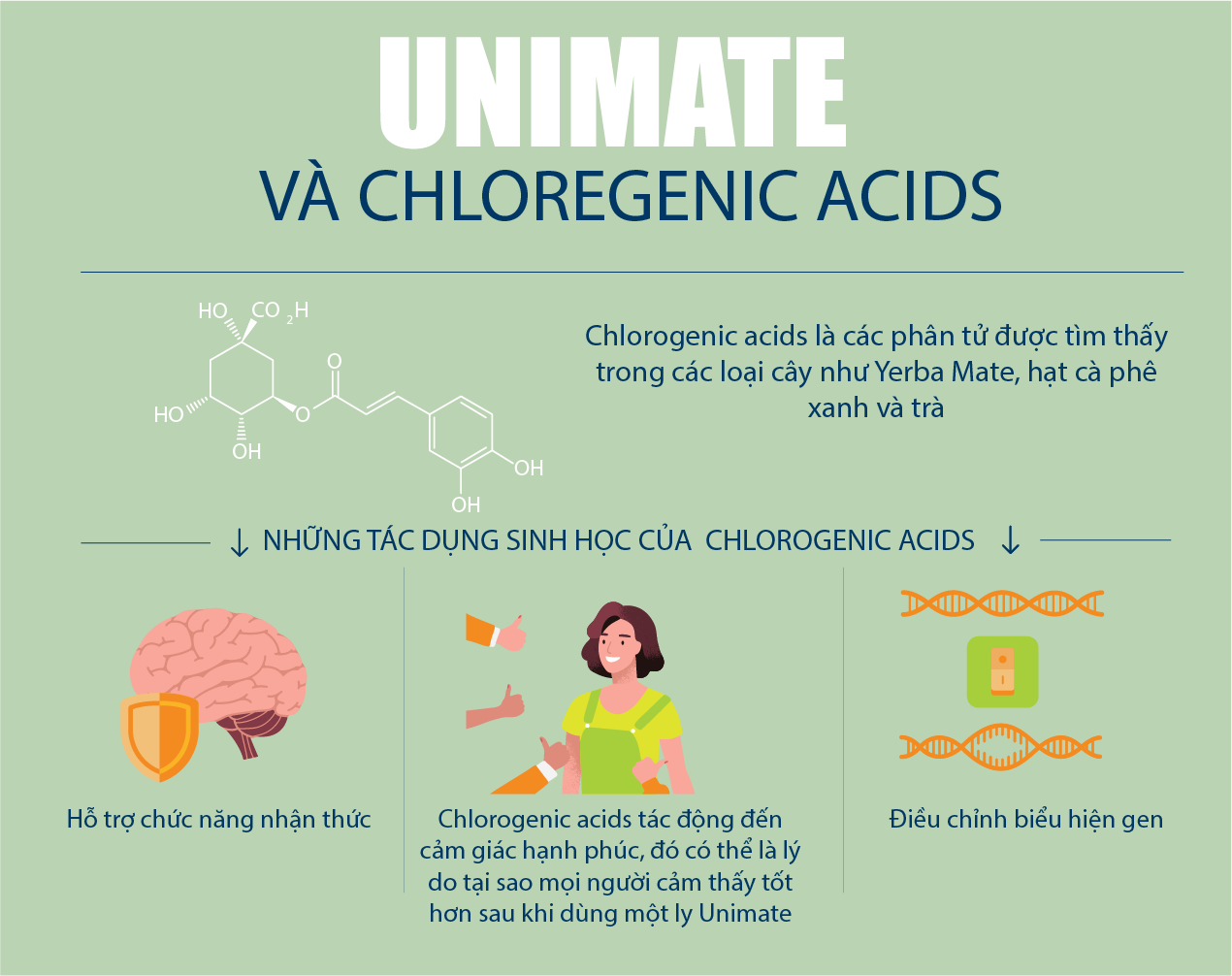 Unimate Unicity chứa hàm lượng axit chlorogenic, theobromine và triterpenoids cao.