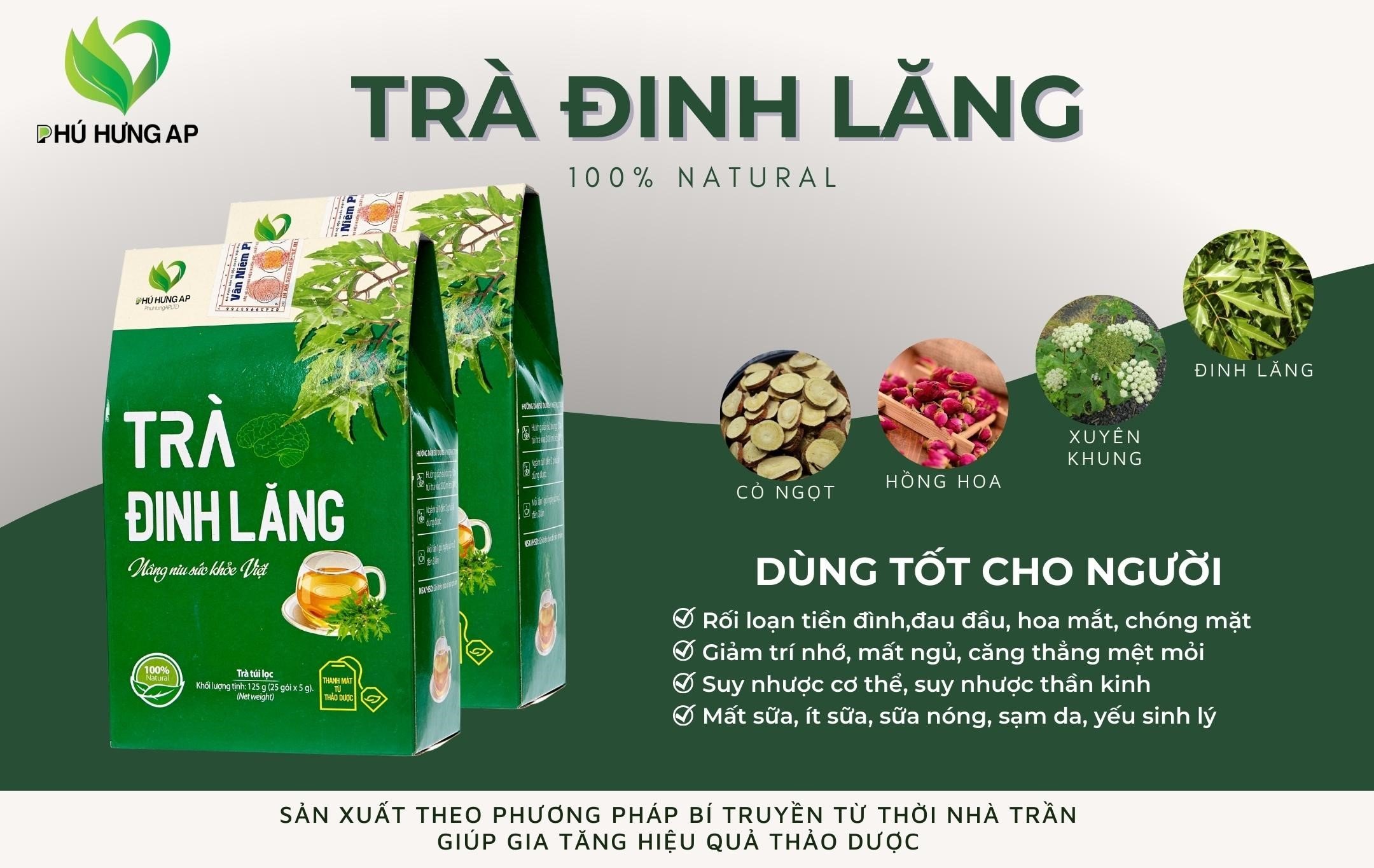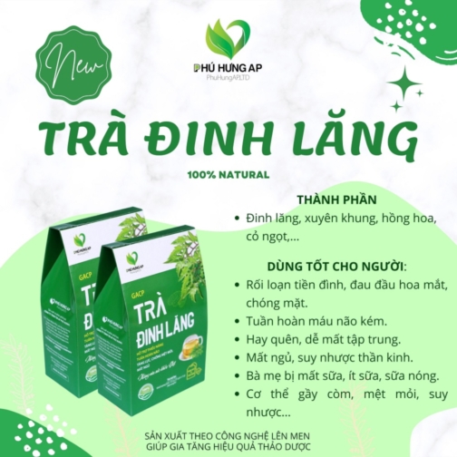 Trà đinh lăng túi lọc là sản phẩm thảo dược được Phú Hưng AP tạo ra để giúp hỗ trợ sức khỏe và cải thiện chất lượng cuộc sống. Sản phẩm này được xuất xứ từ Việt Nam và chứa các thành phần thảo dược chính như đinh lăng, xuyên khung, hồng hoa, cỏ ngọt và các dược liệu khác.