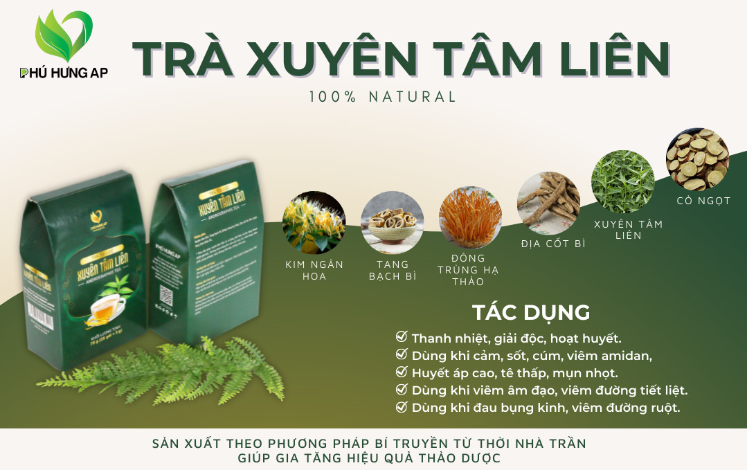Trà túi lọc Xuyên Tâm Liên là một sản phẩm trà dành cho sức khỏe được yêu thích tại Việt Nam. Với thành phần chính là xuyên tâm liên, đông trùng hạ thảo địa cốt bì, tang bạch bì, kim ngân hoa và cam thảo, sản phẩm này có tác dụng thanh nhiệt giải độc, hoạt huyết, tiêu thũng chỉ thống.